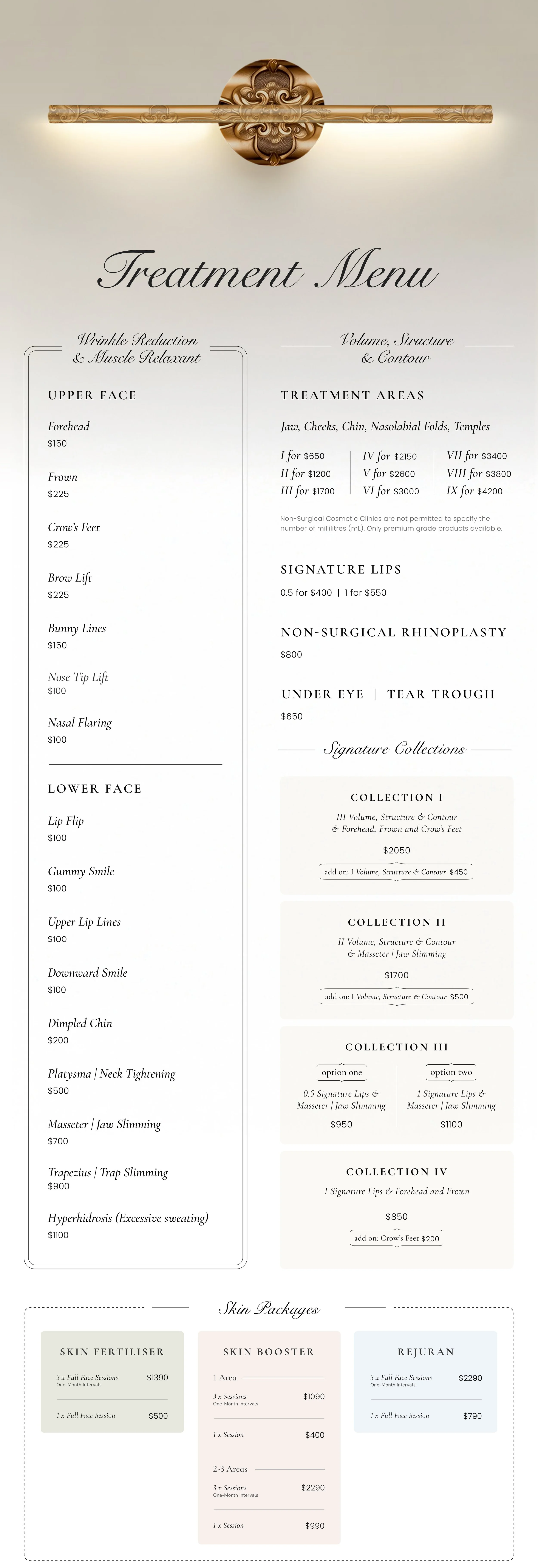 This Treatment Menu is provided strictly as a general guide for budgeting purposes and must not be interpreted as a fixed price list. It is intended solely to give the public a general indication of potential costs associated with treatments at The Manor Clinic. It does not constitute a formal quotation or a binding price agreement. Personalised pricing and treatment recommendations will be provided exclusively during a mandatory consultation, where the prescribing doctor will assess individual suitability and determine the appropriate treatment plan. The final decision to proceed with any treatment rests with the patient after being fully informed of all relevant matters, including potential risks, side effects, downtime, and expected outcomes. The combination of treatments listed is not intended to induce or entice the public. Any combination of treatments will only be provided if deemed suitable by the prescribing doctor following a thorough in-clinic consultation. Scheduling an appointment reserves consultation time, not the provision of a specific treatment. No treatment will proceed without prior assessment, suitability determination, and informed consent. Australian regulations prohibit non-surgical cosmetic clinics from advertising the brand names of prescription medicine, as well as displaying fixed pricing for cosmetic injectable treatments. Non-Surgical Cosmetic Clinics are also not permitted to specify the number of millilitres (mL) or units included in individual treatments or packages. Some of the treatments provided at The Manor Clinic are prescription-only and can only be administered by a qualified medical professional. This content does not promote therapeutic goods in a manner that is inconsistent with legislative requirements. The intention is never to promote the use or supply of a prescription-only medicine or a good containing such a substance. The information provided is intended to demonstrate the types of consultations available and to ensure all patients can make informed and accurate decisions about which cosmetic treatments may be appropriate for them. For further information regarding the products we use or details on treatment pricing, please contact our clinic directly. All procedures at The Manor Clinic carry potential risks, varying longevity, and associated downtime, and results may vary due to individual anatomy and treatment response. Detailed information on risk, recovery, and treatment considerations can be found on The Manor Clinic website. The information provided here, including text, images, and treatment descriptions, is indicative only and intended for informational purposes. It does not replace professional medical advice. For personalised advice, please contact The Manor Clinic directly.